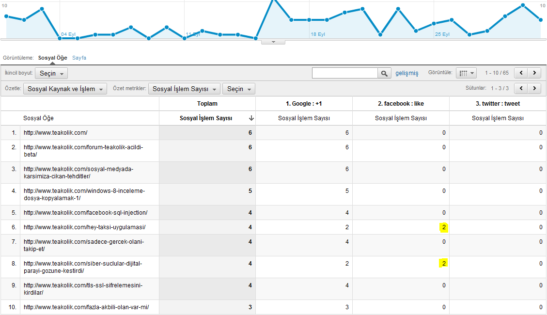 Yeni arayüzde aktif olan bu özellik sayesinde Google Analytics verilerimiz içerisinde internet sayfamızın Sosyal Ağlar üzerinde yapılan paylaşımları, hangi sayfalarımızın etkileşim içerisine girdiğini görebilmeye başladık. Google Analytics verileri ile bu paylaşımları rahatlıkla izleyebileceğiz.
