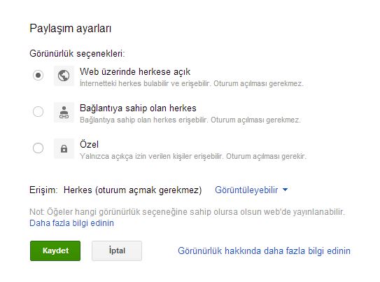Öncelikle Google Drive hizmetinize giriş yapın. Drive içerisine bir klasör açın ve bu klasörü paylaşıma açın. Paylaşıma açarken dikkat etmeniz gereken “Web Üzerinde Herkese Açık” şeklinde paylaşım yapın. Sonrasında bu klasör içine bir index.html attığınız zaman Web üzerinde ulaşabilirsiniz. Paylaşıma açarken de size uzun bir bağlantı veriyor.