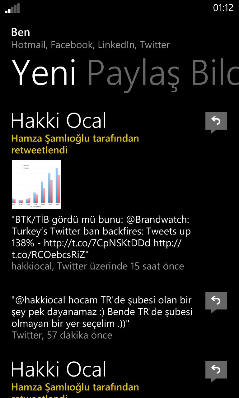 Basit bir arayüz olsa dahi rahatlıkla, VPN kullanmadan, DNS girmeden Twitter’a erişebilirsiniz! Çünkü Windows Phone 8 işletim sistemine, Twitter hesabınızı “Ayarlar > E-posta+Hesaplar” menüsünden Twitter hesabınızı eklediğinizde uygulama, Windows Phone serverları üzerinden internete çıkıyor!