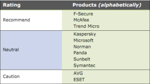 Raporuna şöyle bir baktığımız zaman “Zararlı yazılım temizleme becerisinde” FSecure’ün üstünlüğünü görebilmekteyiz. Trend Micro’nun Malware bloke etmedeki üstün başarısı maalesef ki Exploit bloke etmedeki performansı ile gölgelenmekte. İkinci sırada ise McAfee’yi görmekteyiz. Başarısı FSecure’yi yakalamakte olduğunu gösteriyor.