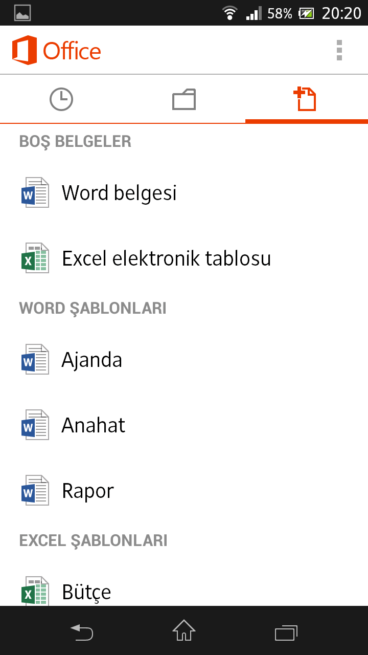 Son kullandığınız ve Skydrive belgelerinizin yanı sıra, ilk ekrandaki sekmeler arasında yeni bir boş belge oluşturmak için kısayollar görülüyor. Bu sayede tek bir dokunuşla telefonunuzdan yeni bir belge açabiliyorsunuz.