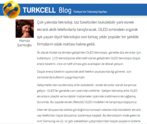 Turkcell Blog İnternet sayfasına konuk yazar olarak 10.06.2013 tarihinde katıldım. Esnek Ekranlara Hazır Mısınız? başlıklı yazıma Turkcell Blog’da yer verildi.
