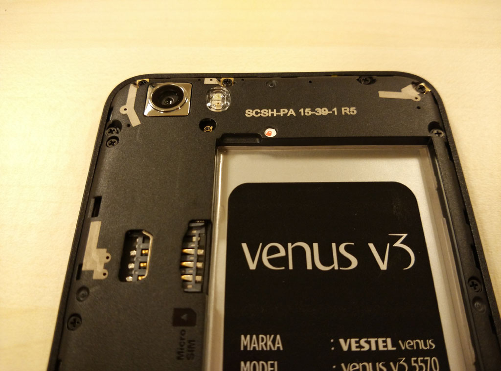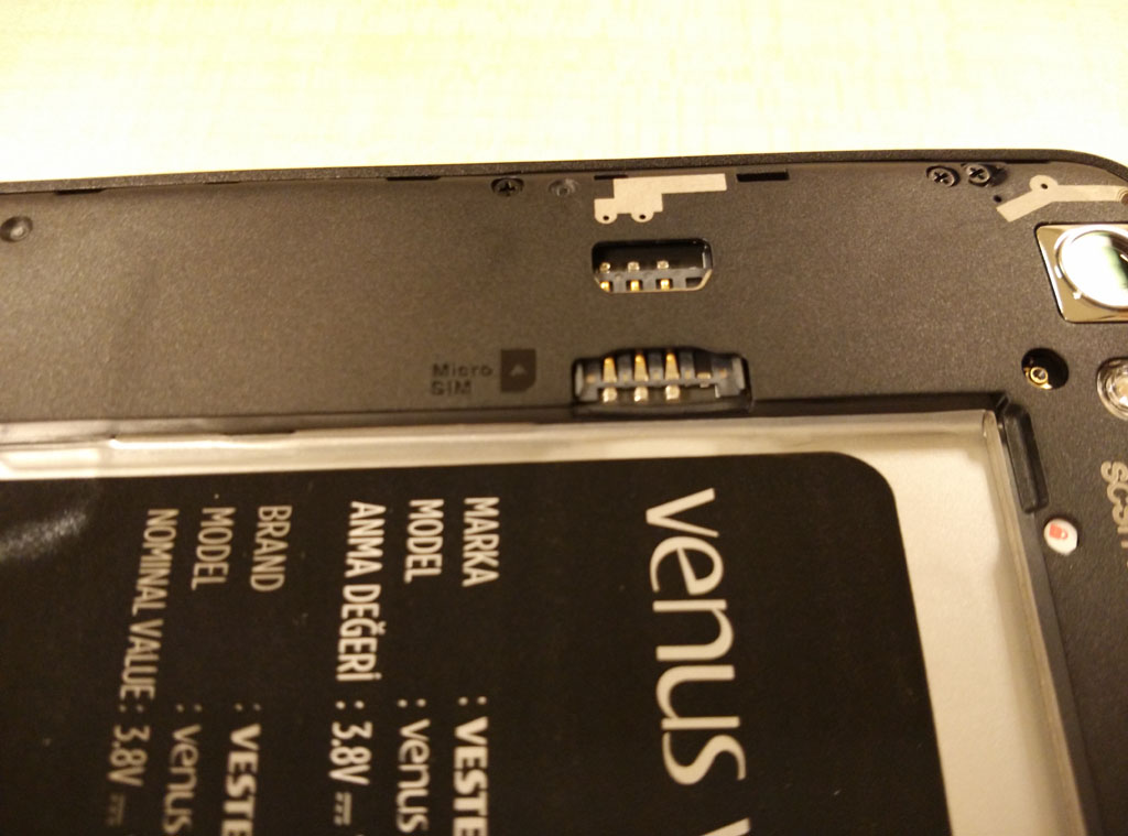 Vestel Venus V3’ün ön yüzünde sadece “Venus” markası bulunuyor. Telefonun arka kısmına geçildiğinde ise sol üst köşede kamera ve flaşı görüyoruz. Üst orta kısmına ise “V” harfinin biraz daha gelişmiş bir versiyonu olan logonun yerleştirildiğini görüyoruz.